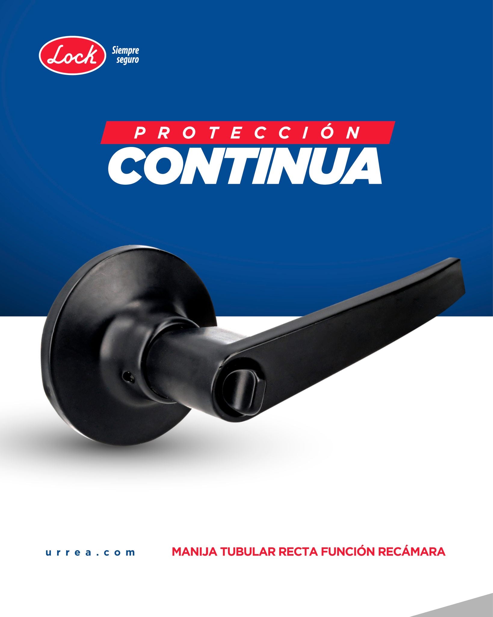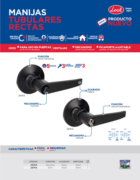 Manija tubular recta función recámara, negra, llave estándar, En blíster
