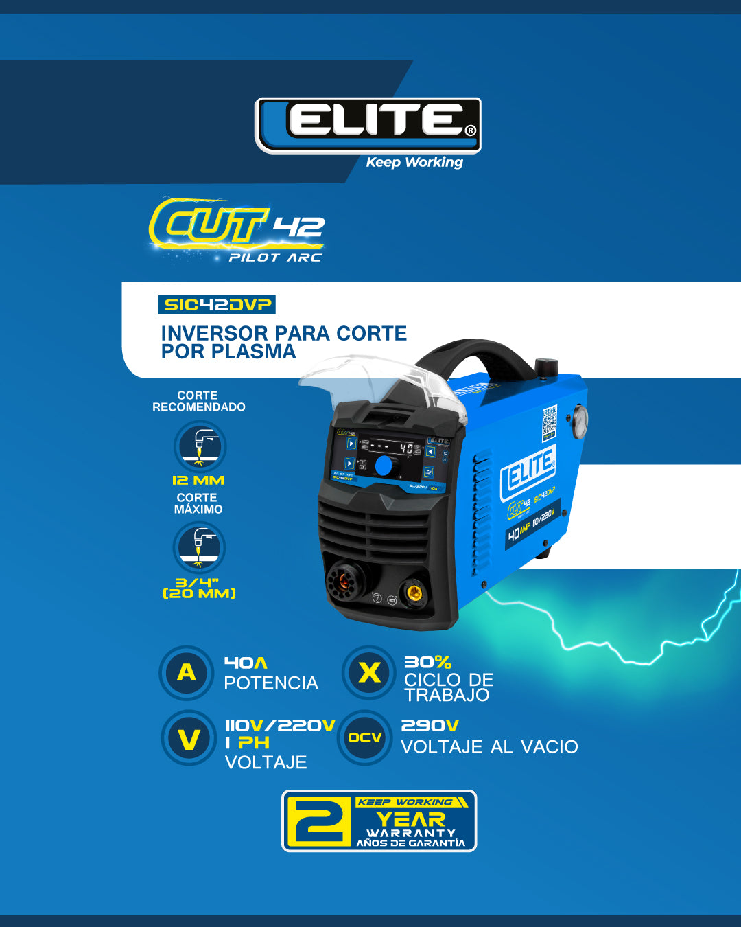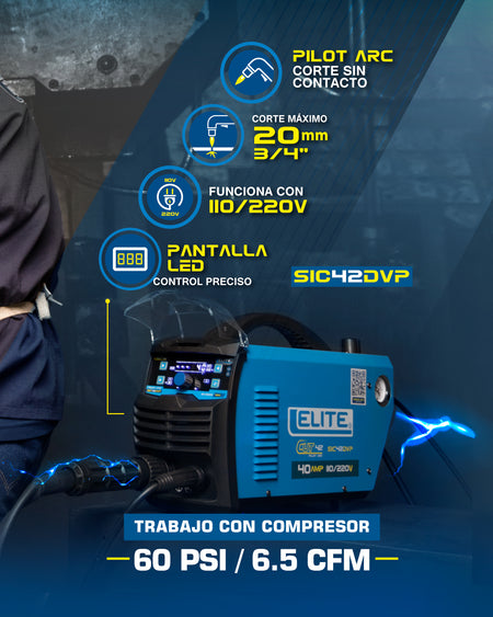 PRECISION Y PODER COMPACTO: El cortador por plasma Elite SIC42DVP es tu solución definitiva para cortes profesionales de materiales metálicos. Con tecnología DUAL VOLTAGE que te permite conectar a 110V o 220V sin complicaciones. Tecnología PILOT ARC para arranque sin contacto, minimizando el desgaste de consumibles. Panel LED intuitivo con controles 2T/4T y ajustes de pre y post gas. Ideal para talleres, construcción y trabajos de campo donde la portabilidad y calidad son esenciales.