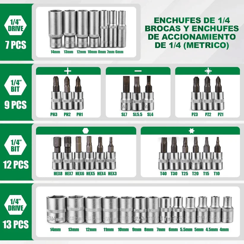 - 13 dados mando 1/4" cortos: 4, 4.5, 5, 5.5, 6, 7, 8, 9, 10, 11, 12, 13, 14 mm