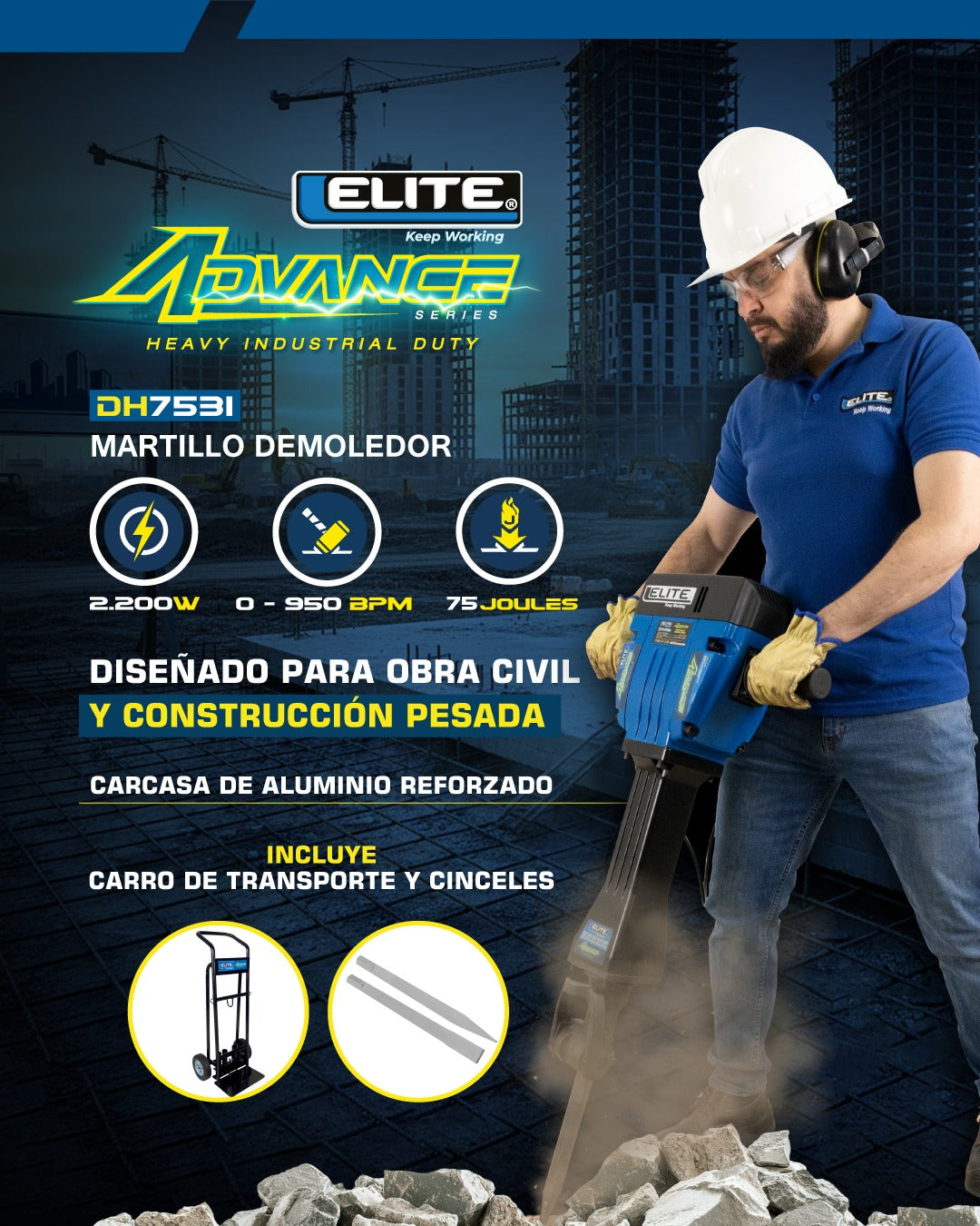 Herramienta diseñada para realizar trabajos en obras civiles, residenciales y de demolición en losas de concreto, cargas medias de cimentación, ruptura de concretos pavimentos y otros materiales , restauracion en general de carreteras y vias.