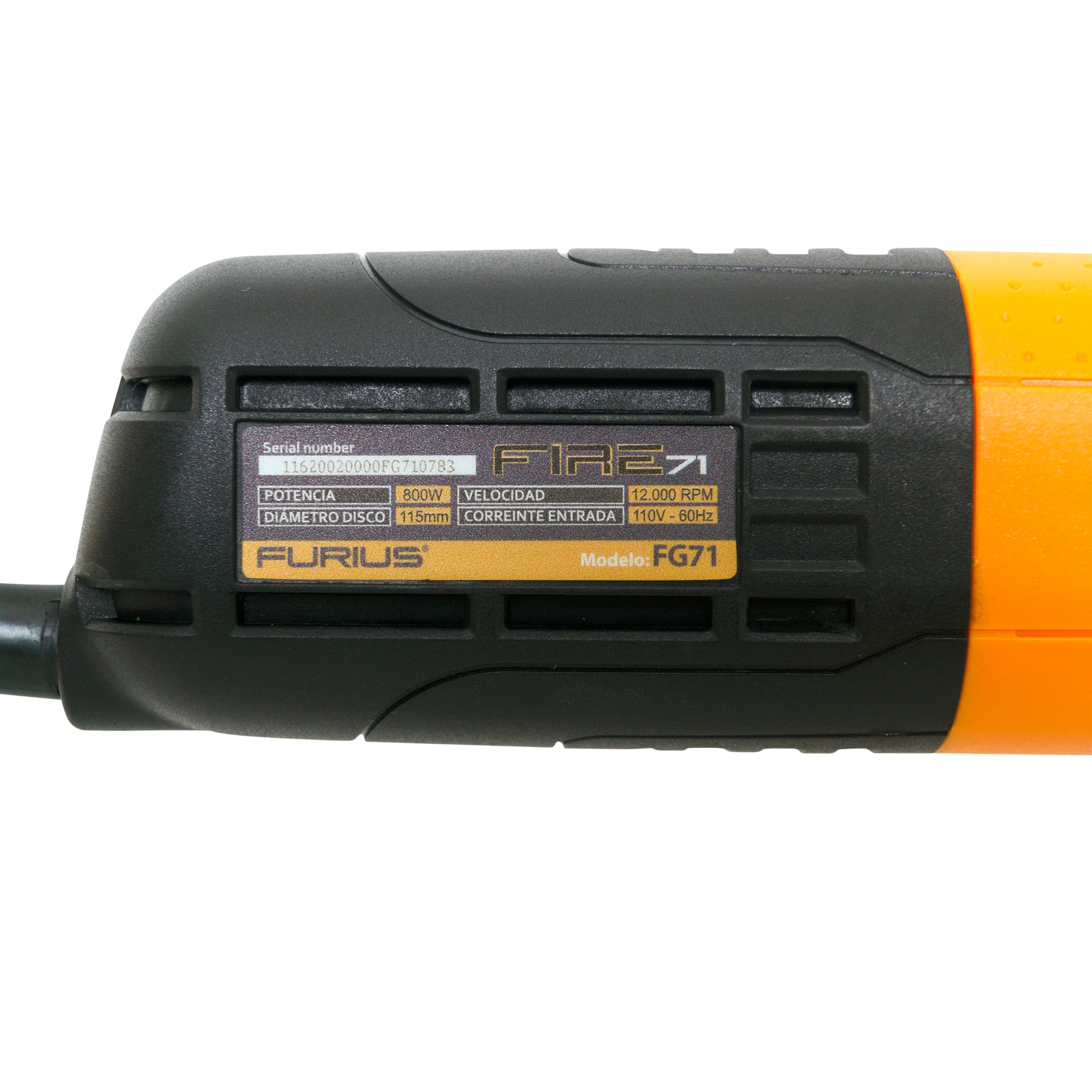 Pulidora eléctrica angular Fire 71 Furius para uso profesional.; Cuenta con 800 Watts y 11.000 RPM de velocidad.; Su diseño ergonómico permitirá realizar las tareas de forma cómoda y segura.